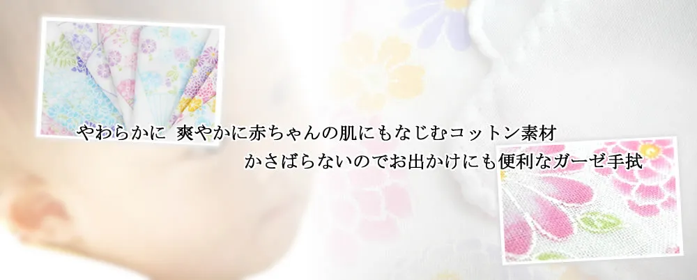 赤ちゃんからお年寄りの方まで安心してご使用いただける肌に優しい手触りと、やわらかな風合いのガーゼ手拭いです。